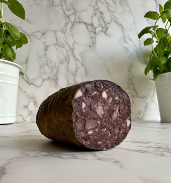 Das ist unsere Art der regionalen Verständigung. Mit viel duftenden Majoran abgeschmeckte Blutwurst, dazu die kleinen zarten Fleischwürfel unter gemischt und in Naturdärme abgefüllt. Das ist grenzenloser Genuß für Sie!