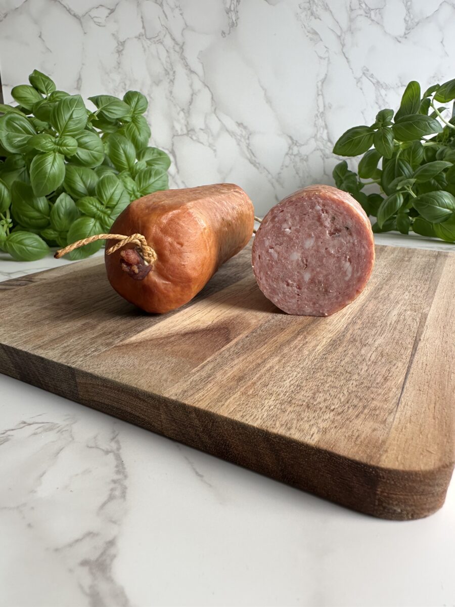 Stück für Stück ein kräftiger Genuss. Knoblauch, edle Gewürze und dazu goldbraun über Buchenholz geräuchert, lassen die Kochsalami zu einem edlen Geschmackssympathieträger werden. Auf allen Wegen, ob sandig oder steinig.